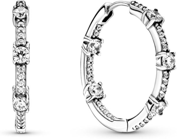 Pendientes Pandora en plata de ley con circonitas transparentes, los aros clásicos de plata esterlina obtienen un toque contemporáneo con la adición de brillantes piedras de circonita cúbica transparente y corazones recortados. Su tamaño los convierte en los básicos perfectos para todas las mujeres.