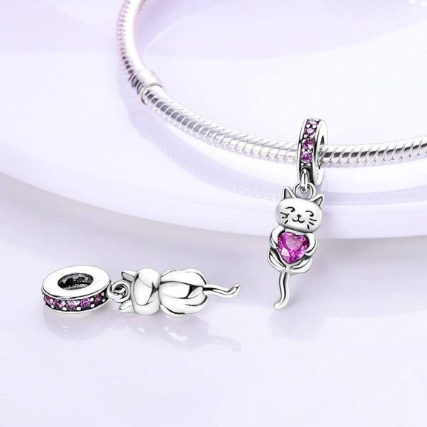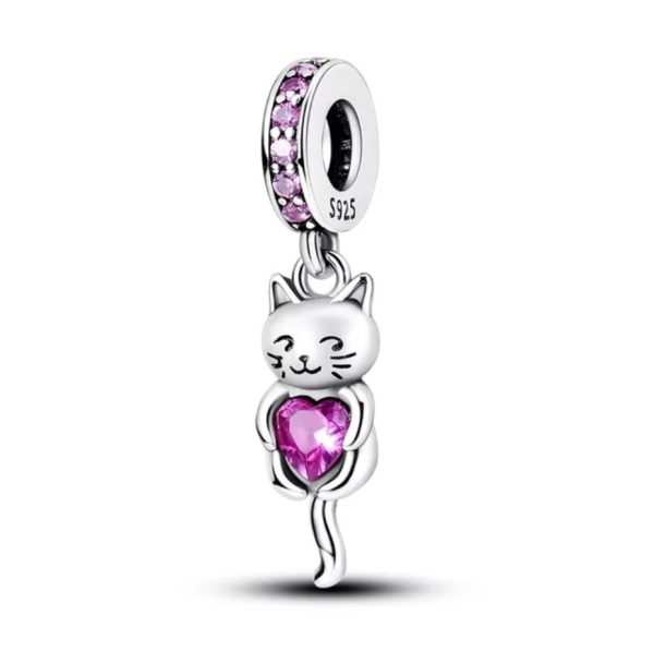 Charm Pandora Gato Gata Corazón Rosa Brillante Fabricado En Plata S925
