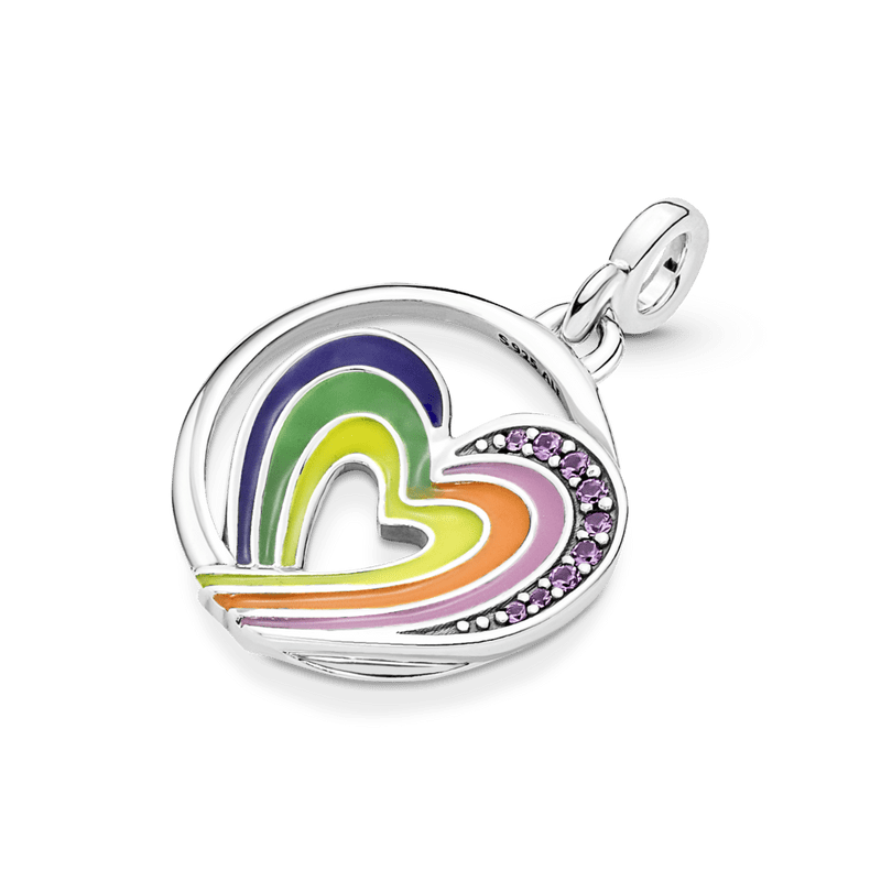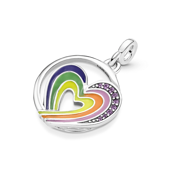 La libertad de ser YO. Lleva contigo este símbolo del amor y la inclusión a donde sea que vayas. Este charm en forma de corazón asimétrico tiene un arcoíris pintado con esmalte y una hilera de cristales sintéticos morados inspirados en el arcoíris como símbolo de esperanza y libertad. Este medallón con forma de corazón tiene un gancho cerrado y está hecho para darle estilo en los conectores de estilo Pandora ME que se pueden abrir en tus brazaletes y collares de eslabones y en tus anillos y aros, como celebración de tu autenticidad.