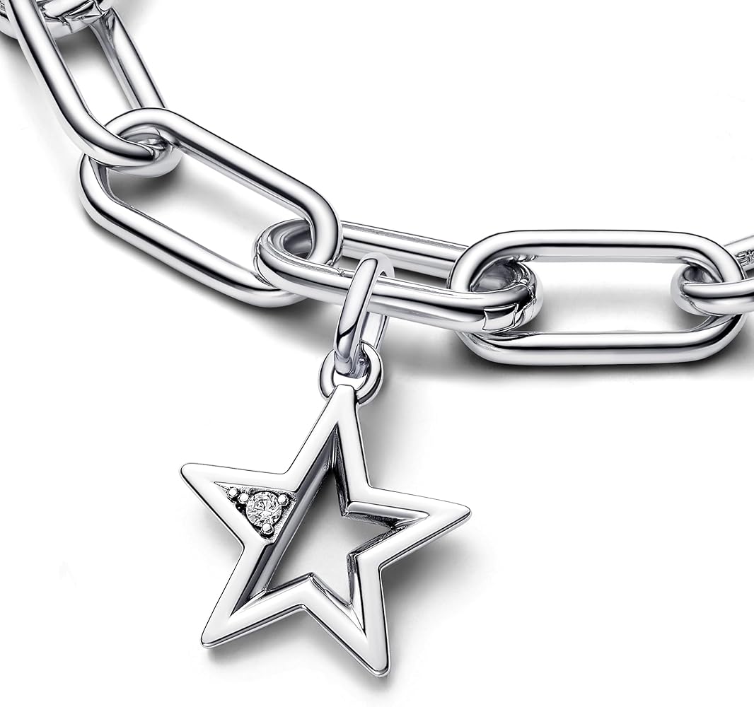 Las estrellas siempre estarán alineadas cuando lleves el Charm Medallón Estrella Brillante Pandora ME. Con un perfil en forma de prisma, este charm con forma de estrella en plata de primera ley se presenta embellecido con brillante gema engastada a mano en una de sus cinco puntas. El reverso se ha decorado con microesferas, una línea en relieve y un orificio con forma de triángulo en el engaste a través del cual se puede ver la gema. Regala este charm de medallón a alguien que haga brillar tus ojos o úsalo como recordatorio de que tú eres la estrella de tu universo. Compatible con Pandora ME y Pandora Moments.