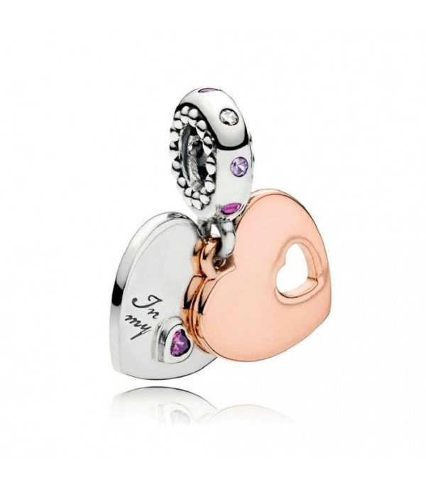 Charm colgante PANDORA Parte de mi Corazón en plata de primera ley y PANDORA Rose con una aleación única de metales, con plata de baja aleación y cobre con un recubrimiento de oro de segunda ley, adornado con circonitas cúbicas moradas y transparentes y cristal rosa y lila con grabado “In my heart”.