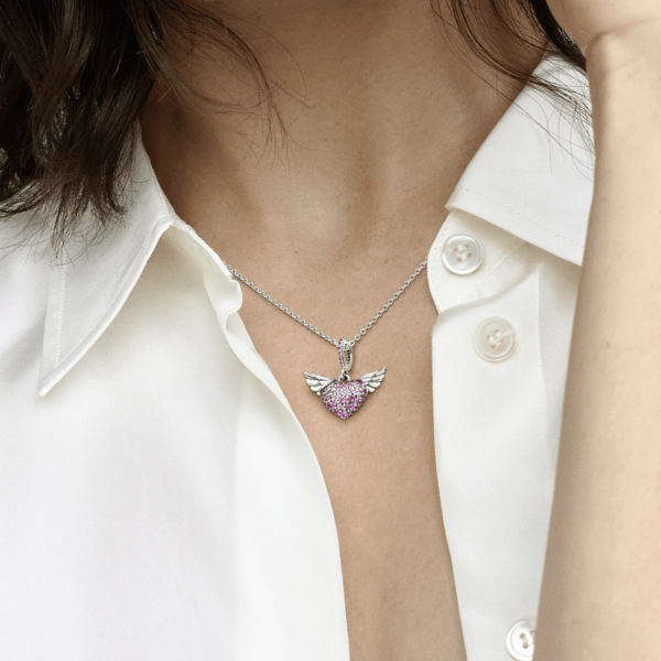 Nuestro collar de pavé Corazón y alas de ángel cayó del cielo. Perfecto para regalarlo al ángel de tu vida o para agregarlo a tu propia colección, este collar especial está acabado a mano en plata esterlina y adornado con un cristal rosa en pavé. Este pendiente se puede ajustar a tres longitudes diferentes y tomó su inspiración de los ángeles como símbolo de amor y protección.